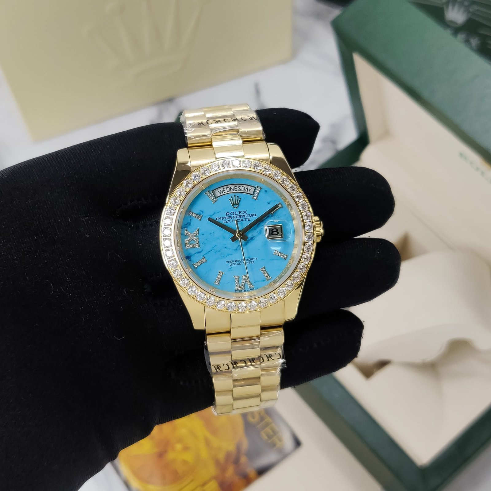 The Rolex Day-Date Blue Dial Diamond Bezel is a stunning timepiece that combines sophistication and functionality. With its captivating blue dial featuring diamond markers, this watch ensures you stand out on any occasion. The diamond-studded bezel adds a layer of elegance while the day and date indicator offers practical features for everyday wear.