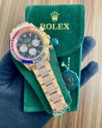 The Rolex Daytona Rainbow Diamond Watch is a true statement piece for those who appreciate style and precision. The stunning black dial features eye-catching rainbow diamond figures that add a unique flair, while the diamond bezel elevates the watch’s overall aesthetic, making it a perfect accessory for any occasion.