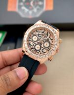 The Rolex Daytona Tiger Eye is an incredible blend of style and function that will elevate any man’s watch collection. With its striking 42mm rose gold dial and diamond-studded bezel, this timepiece captures attention effortlessly, making it a modern classic.