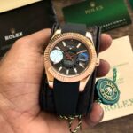 The Rolex Sky Dweller Grey watch blends elegance and functionality perfectly. With a rosegold tone steel body and an automatic movement, it’s designed for precision and style.