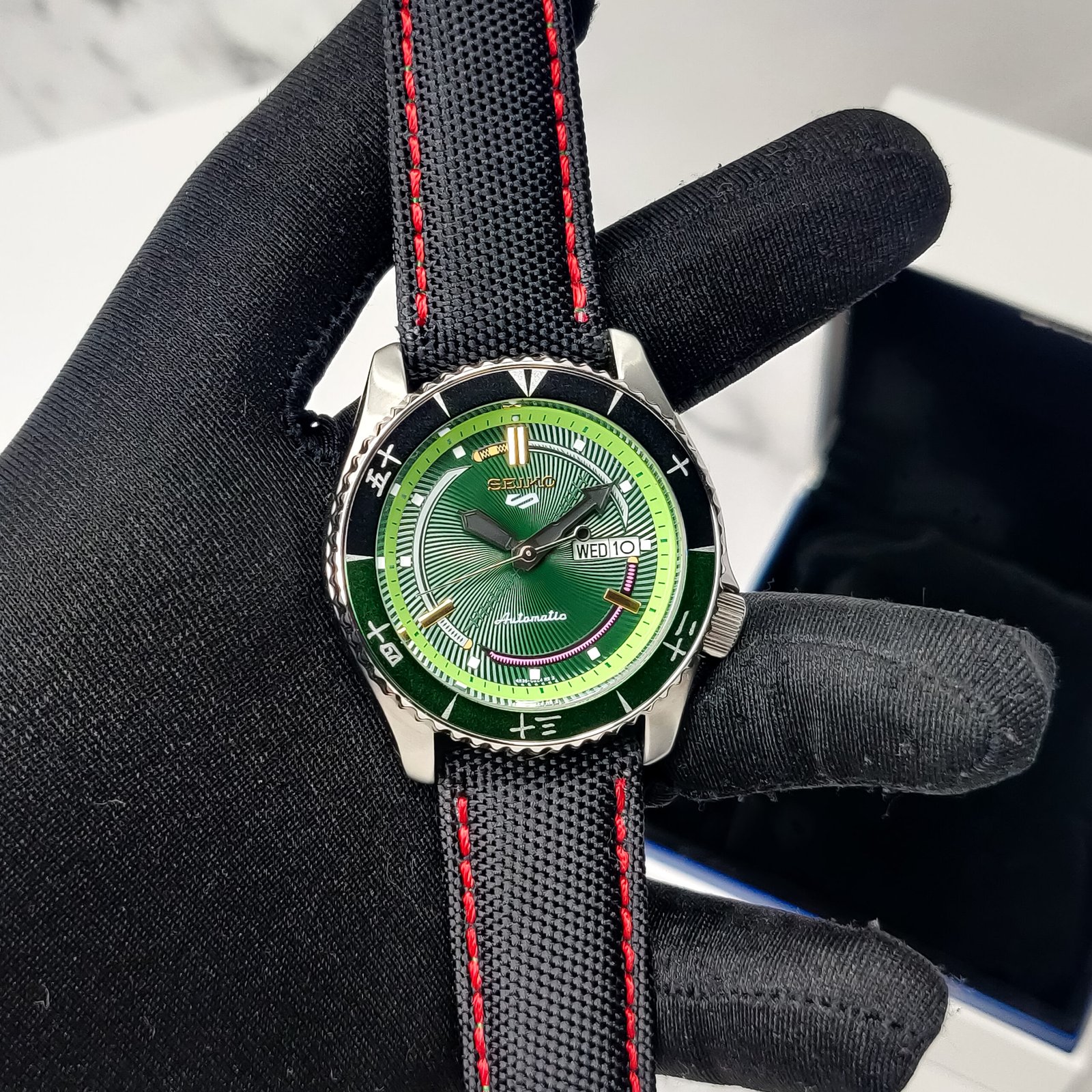 The Seiko 5 Sports ONE PIECE Roronoa Zoro SRPF57K1 combines style and functionality, featuring a green textured dial and a self-winding movement.