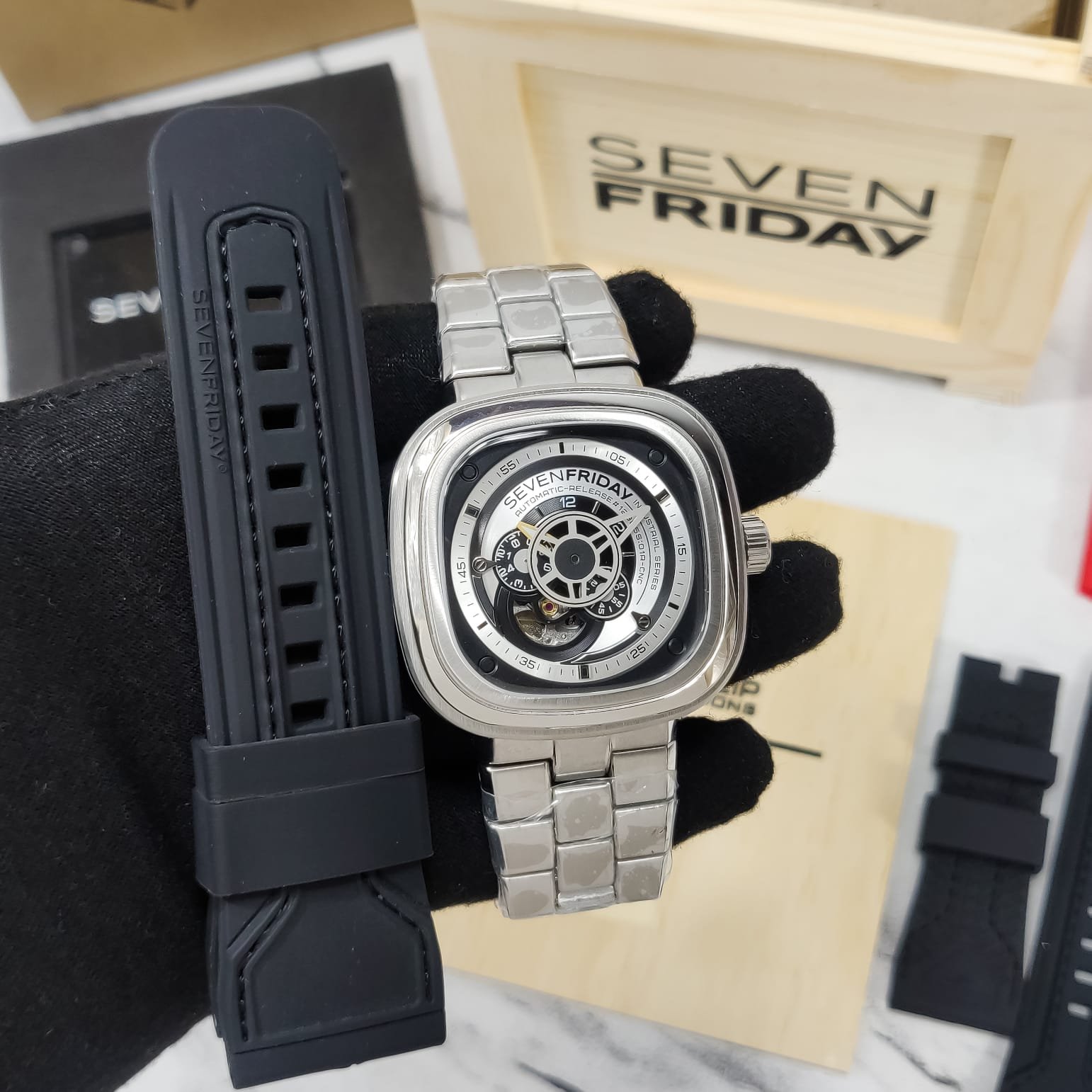The Seven Friday Industrial Series P1B is not just a watch; it’s a statement piece for those who appreciate innovative design and superior craftsmanship. The polished square case, measuring 47mm x 47.6mm, immediately catches your eye with its glossy bezel and unique skeleton dial. This watch is powered by reliable Japanese self-winding automatic machinery, ensuring precision and longevity in timekeeping.