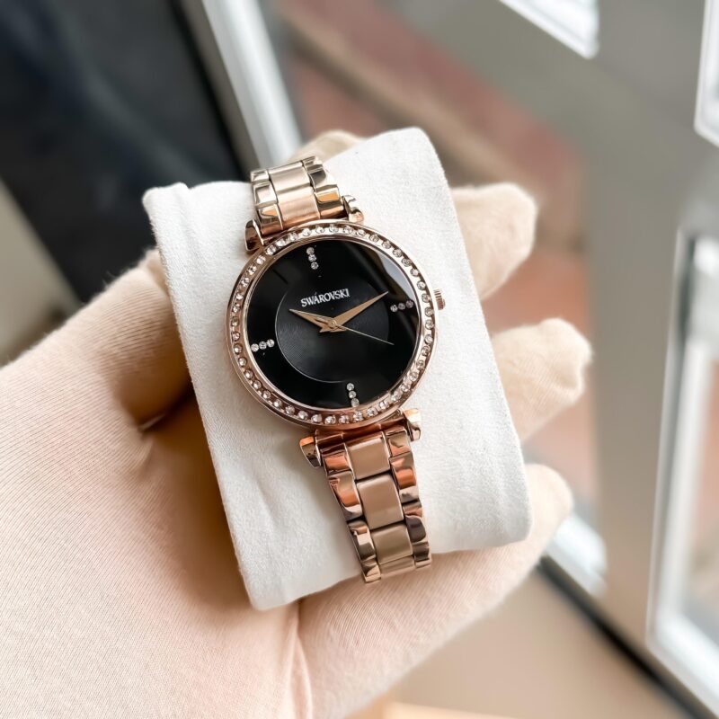 Discover the elegance of the Swarovski Lake Shimmer, featuring a stunning black dial, rose gold case, and reliable Japanese technology.