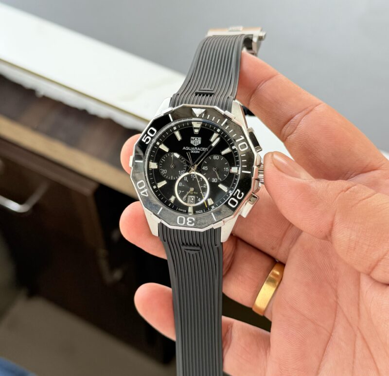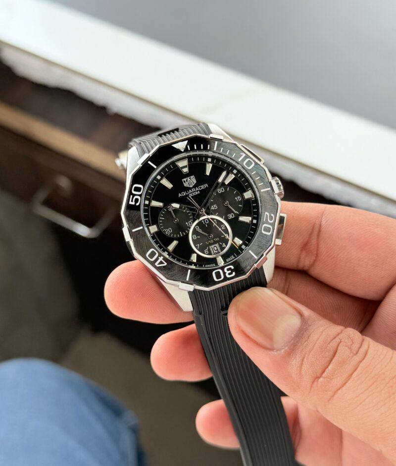 The Tag Heuer Aquaracer Calibre 5 Chronograph offers a remarkable balance of style and functionality, perfect for the modern man. The robust 45mm stainless steel case is complemented by a striking black dial, ensuring that it stands out in any setting.