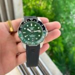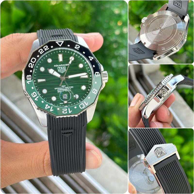 The Tag Heuer Aquaracer GMT Diver is a watch that blends style and functionality effortlessly. With its robust 42mm stainless steel case, this timepiece is ready for any adventure, whether you’re diving into the ocean or navigating through your day-to-day tasks. The vibrant green dial stands out beautifully, complemented by a dual-color ceramic bezel that ensures precision when timing your adventures.