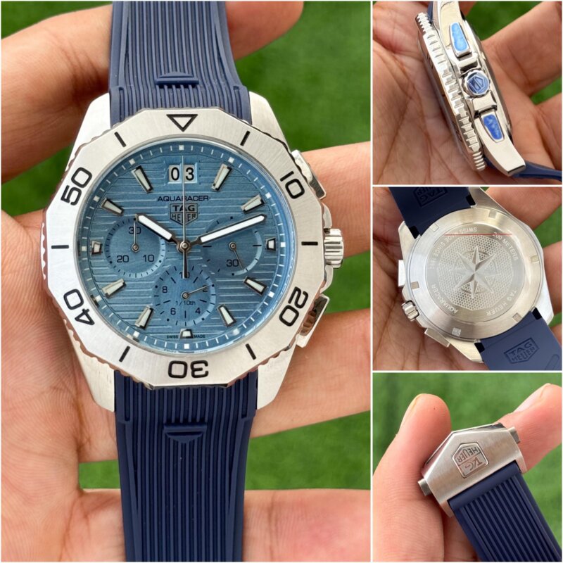 The Tag Heuer Aquaracer Sky Blue is not just a watch; it’s a bold statement of sophistication. With its striking sky blue dial, this timepiece effortlessly combines style and functionality. The round case, crafted from a full silver metal body, exudes confidence and durability, making it perfect for both casual outings and formal events.