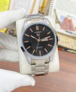 Measuring a perfect 41mm in size, it features a practical day and date indicator that enhances its functionality. The fixed stainless steel bezel and full silver metal strap add to its sophisticated charm, making it suitable for both casual and formal occasions.