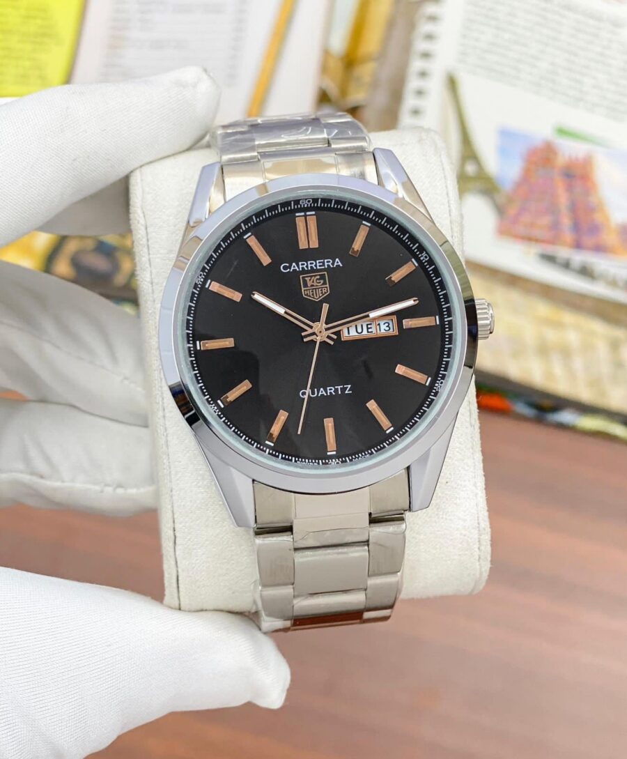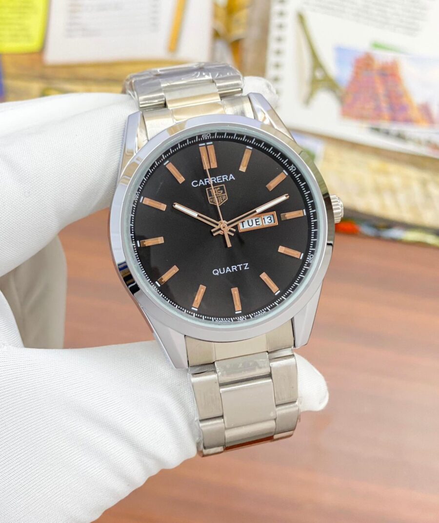 The Tag Heuer Carrera Caliber 5 is more than just a watch; it’s a true reflection of your style and confidence. With its stunning black sunray brushed dial and rhodium-plated hands, this three-hand watch commands attention while maintaining an elegant presence.