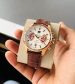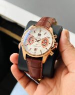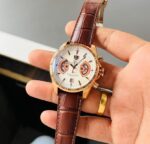 The striking white dial is not just visually appealing, but it also features working chronographs and a 24-hour analog display, making it practical for daily wear. The date indicator is a thoughtful addition, enhancing its functionality.