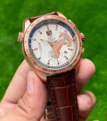 The Tag Heuer Carrera Calibre 36 Racing is a stunning embodiment of sporty elegance. Its striking copper stainless steel dial, set against a clear off-white background, creates a visually captivating experience. The chronograph functionality, featuring a 60-minute stopwatch and 24-hour timing, is perfect for those who appreciate precision and performance in their timepieces.