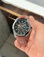 The open glass back adds a sophisticated touch, allowing you to appreciate the craftsmanship within. Paired with a luxurious brown alligator-style leather band, it perfectly complements both casual and formal outfits. The sturdy stainless steel black body ensures durability while the original clasp lock provides peace of mind during wear.