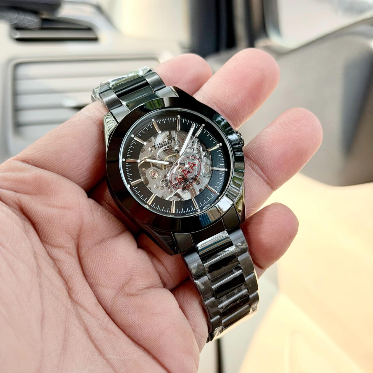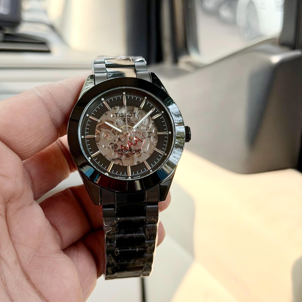 Discover the Tissot 7AA Premium Collection with a stunning black skeleton dial and comfortable 5-link strap—a perfect blend of style and function.