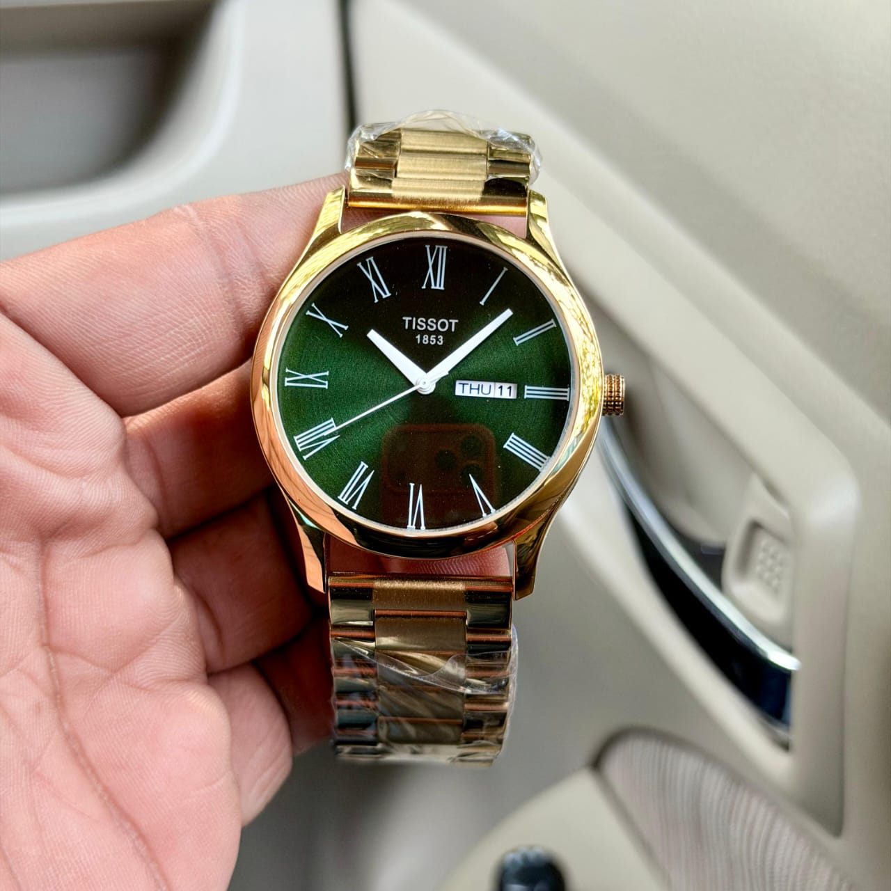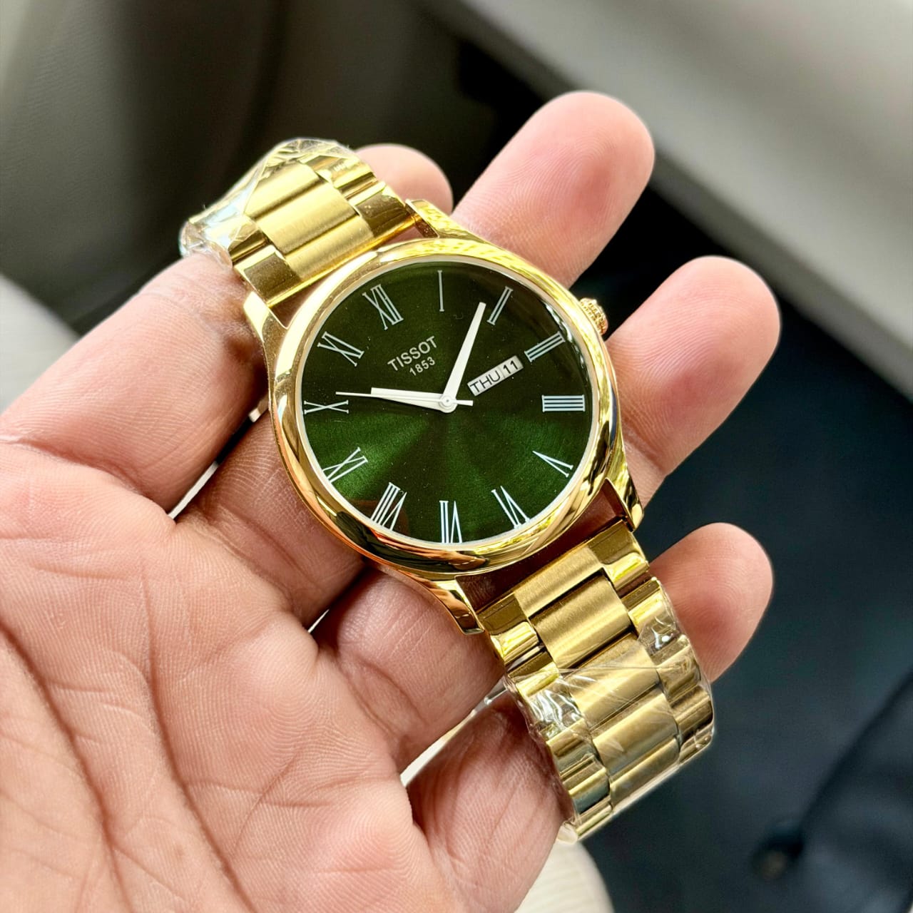 The Tissot Day Date Green Dial watch is the perfect blend of elegance and functionality. Its 40mm steel case offers a sturdy yet refined look, while the vibrant green dial adds a unique flair to any outfit. The golden band strap enhances its overall sophistication, making it an ideal accessory for both casual and formal occasions.