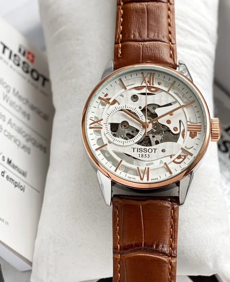 The Tissot LeLocle Skeleton White Watch beautifully combines elegance and functionality. Designed for men who appreciate a sophisticated timepiece, this watch features a striking solid copper bezel that adds a warm touch to its overall look.
