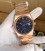 The Tissot PRX is a perfect blend of sophistication and practicality for any watch enthusiast. With its striking 42mm golden stainless steel case and a captivating blue dial, it captures attention while offering functionality. The date window at 3 o’clock adds a practical touch, ensuring you never miss an important date.