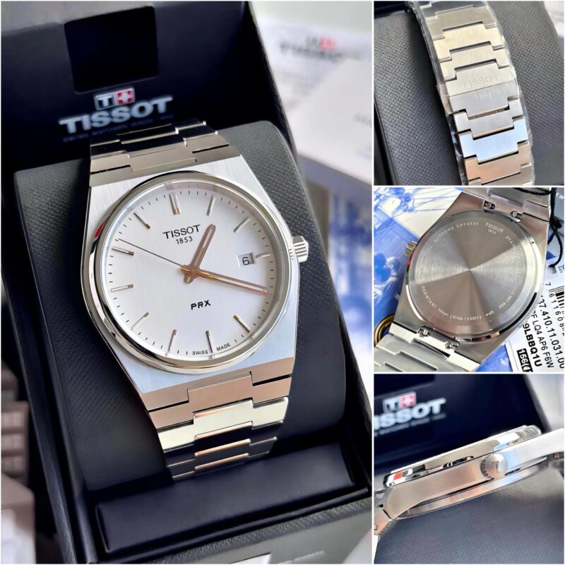 The TISSOT PRX White Dial combines style and functionality, featuring a 40mm stainless steel case, a clean white dial, and a comfortable bracelet design.