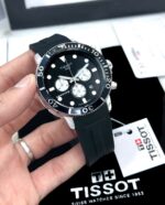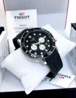 The Tissot Seastar Chronograph Black Watch is the perfect blend of functionality and style, designed for men who appreciate precision and elegance. With a bold 45.5mm black dial, it features striking white sub-dials and silver hands that ensure readability in any setting.
