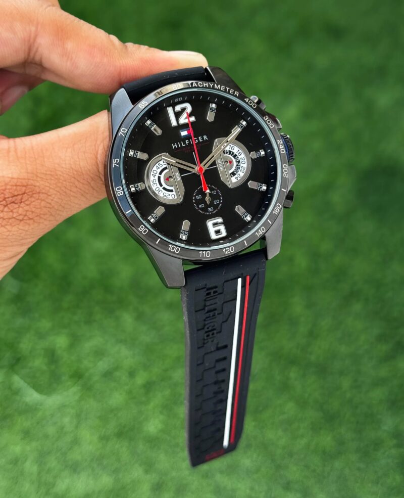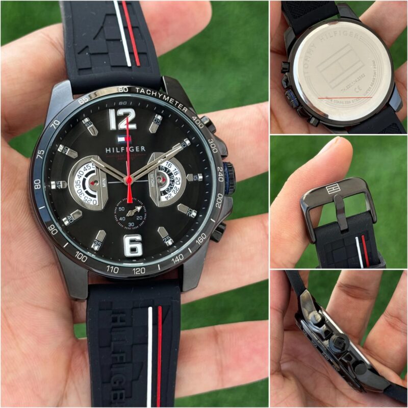 The Tommy Hilfiger Chronograph Black Dial represents a blend of style and functionality that’s perfect for any occasion. With its sleek black dial, it offers a modern aesthetic that’s not just about looks but also about performance. The 44mm round case provides a substantial presence on the wrist without overwhelming it, making it suitable for both casual outings and more formal settings.